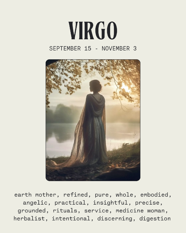 Virgo asks us to become more intimate with the rhythms of our bodies, with the rituals that support us, and the structures that allow our soul to root and thrive. It is not about trying to reach perfection, but it's about bringing devotional presence to the process itself in our day to day, and moment to moment.